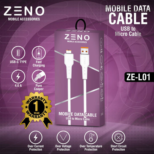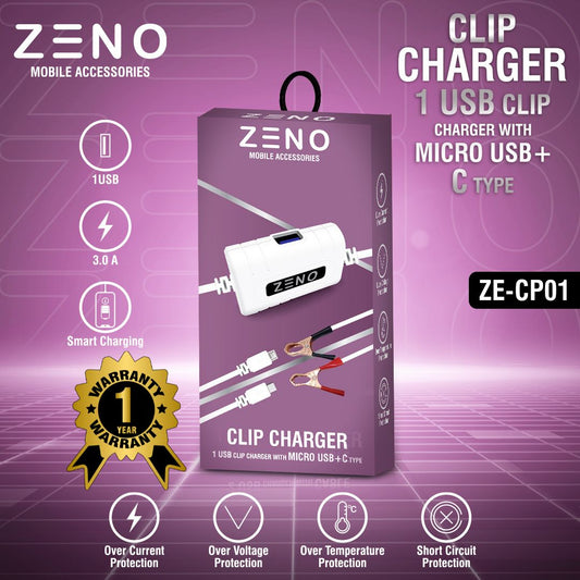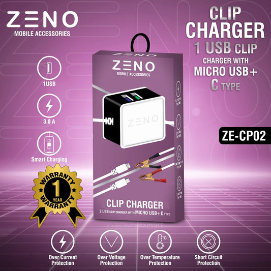 ZENO Single USB Clip Charger With Micro USB and C-type Cable - Versatile & Smart Charging Solution